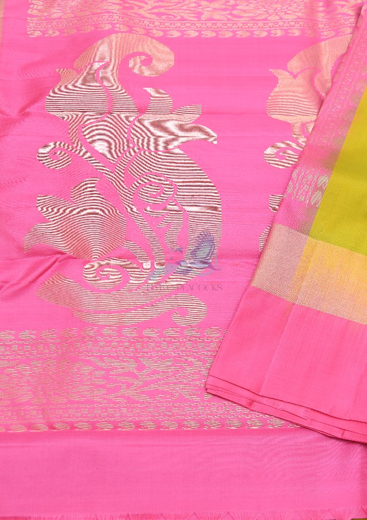 The striking lime body color beautifully contrasts with the pink blouse, creating a vibrant ensemble that is sure to turn heads. Its versatile design complements traditional gold jewelry and modern accessories alike. Easy to maintain with dry-clean care instructions, this saree retains its brilliant sheen and intricate detailing, making it the perfect investment for any wardrobe.