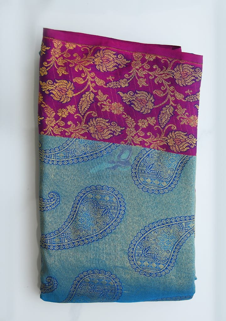 Step into sophistication with this dark blue pure silk saree adorned with intricate tissue mango butta work. The mesmerizing sheen of pure silk and the timeless mango motifs make this saree a true symbol of luxury and tradition. The exquisite pairing of a dark blue body with a regal violet blouse adds a rich, contrasting allure, ensuring you stand out effortlessly at weddings, festive gatherings, and formal events.