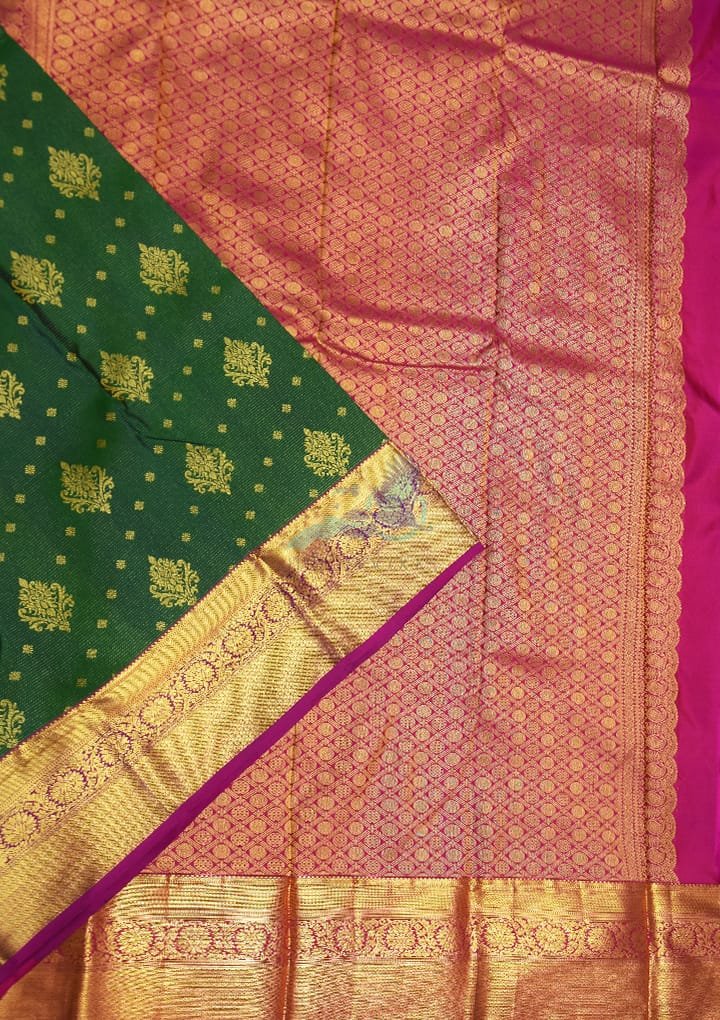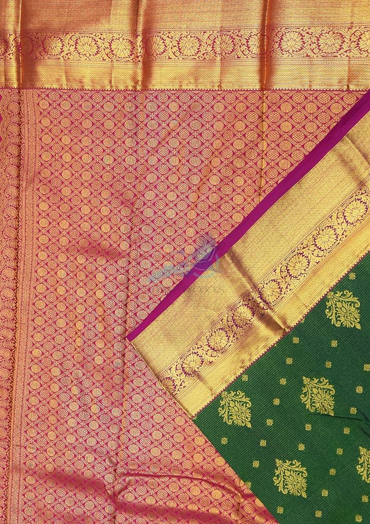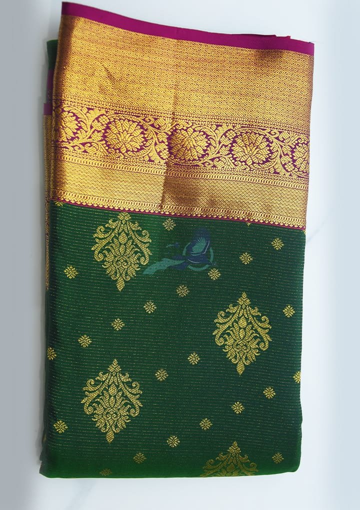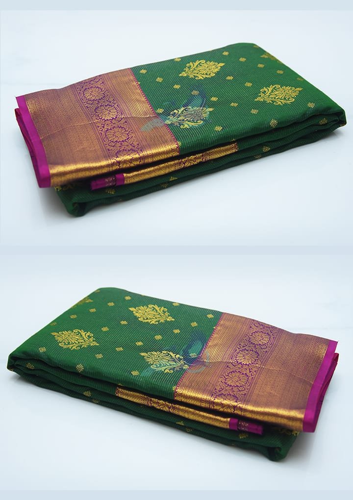 Drape yourself in the sheer sophistication of this dark green pure silk saree adorned with exquisite dollar butta work. The rich, smooth texture of the silk ensures a lightweight yet opulent feel, making it the perfect choice for weddings, festive celebrations, or elegant evening gatherings. This saree exudes an unmatched grandeur, designed for the modern woman who cherishes tradition. The combination of a stunning dark green body and a contrasting dark pink blouse makes it an eye-catching ensemble.