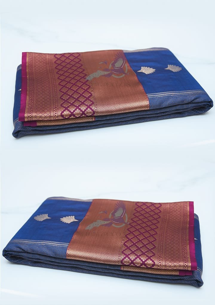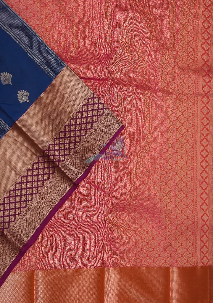 This Pure Silk Dark Blue Saree with Aishu Strip Butta Work is the epitome of refined elegance and tradition. The rich dark blue body adorned with the unique Aishu strip butta detailing adds depth and texture, making it a perfect choice for weddings, celebrations, and formal occasions where sophistication is paramount.